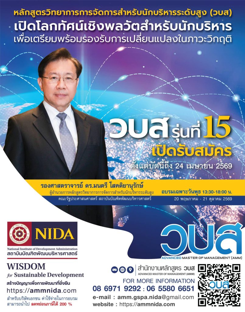 ประกาศรับสมัครหลักสูตรวิทยาการการจัดการสำหรับนักบริหารระดับสูง (วบส) เปิดโลกทัศน์เชิงพลวัตสำหรับนักบริหาร เพื่อเตรียมพร้อมรองรับการเปลี่ยนแปลงในภาวะวิกฤติ วบส รุ่นที่ 15